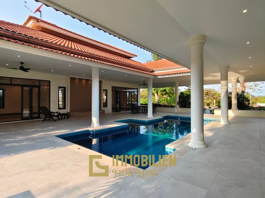 Diese frei stehende Pool Villa befindet sich auf dem Palm Hills Golf Club and Residence Gelände und bietet 450 qm Wohnfläche auf einem großzügigen 2.076 qm großen Grundstück in Cha Am. Die Villa verfügt über drei geräumige Schlafzimmer, vier Badezimmer und einen weitläufigen Wohnbereich mit fließendem Übergang zwischen Innen- und Außen, der sich um einen privaten zentralen Swimmingpool gruppiert.