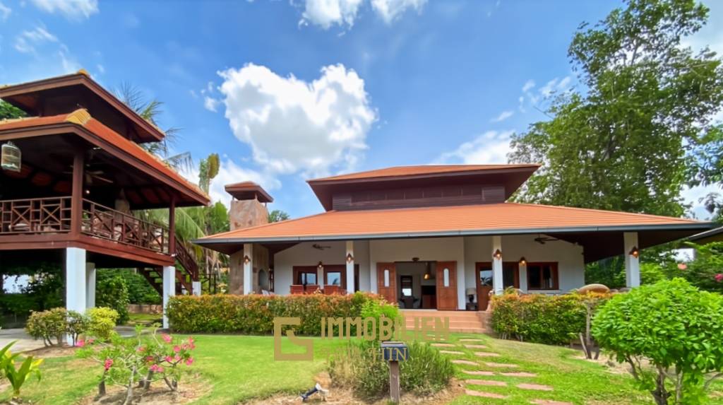 Die Villa im tropischen Architekturstil gebaut, mit einem steilen Ziegeldach und mehreren Dachebenen. Die Villa verfügt über eine große überdachte Veranda und eine breite Treppe führt zu einem erhöhten Sitzbereich mit Blick auf einen gepflegten Rasen und einen angelegten Vorgarten mit blühenden Pflanzen und Hecken. Die Terrassen bieten großzügige Ess- und Wohnbereiche mit Holzdecken, Einbaustrahlern, Deckenventilatoren und Fliesen- oder Holzböden. Natursteinwände mit Bogennischen und Kaminöffnungen verleihen den Außenbereichen zusätzlichen Charme.