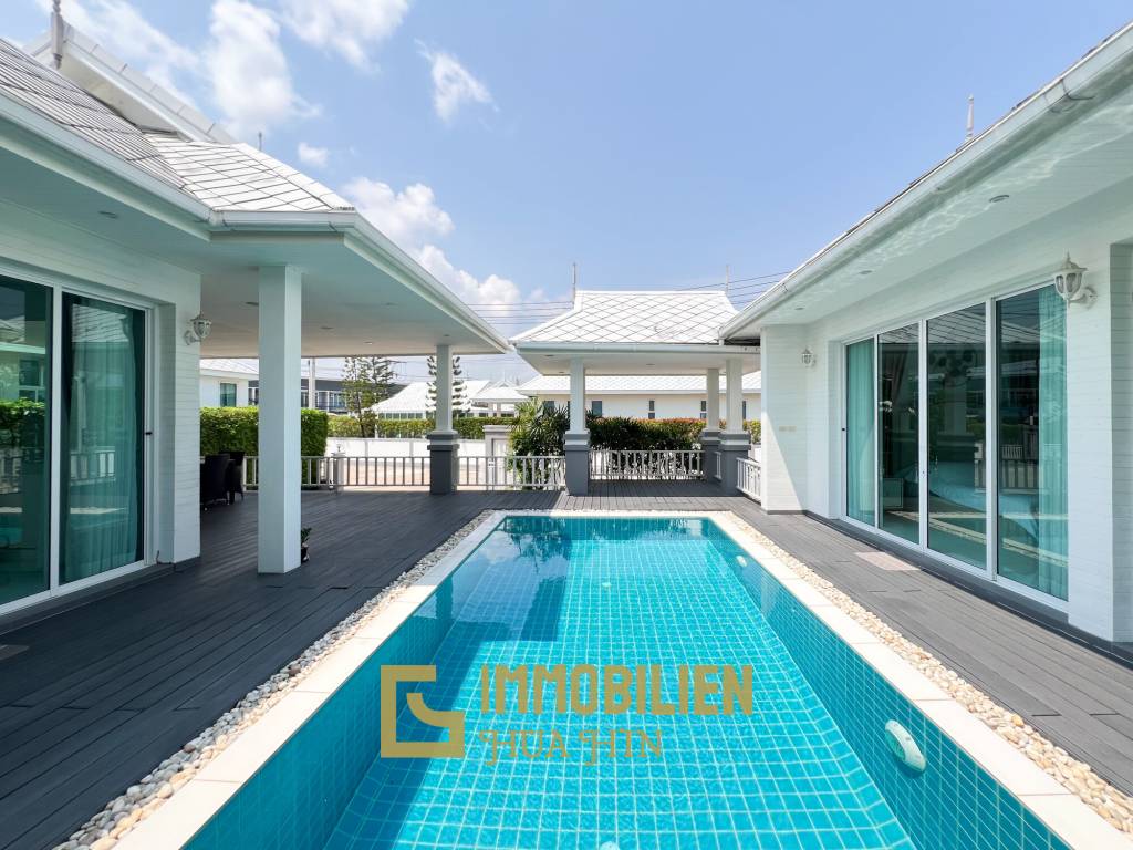 Sie verfügt über drei moderne Schlafzimmer und vier Badezimmer auf einer Ebene. Die Villa ist komplett möbliert und präsentiert sich in einem neutralen, eleganten Stil. Ein rechteckiger Pool bildet das Herzstück des Hauses und ist von bodentiefen Glasschiebetüren umgeben, die für viel Tageslicht sorgen.